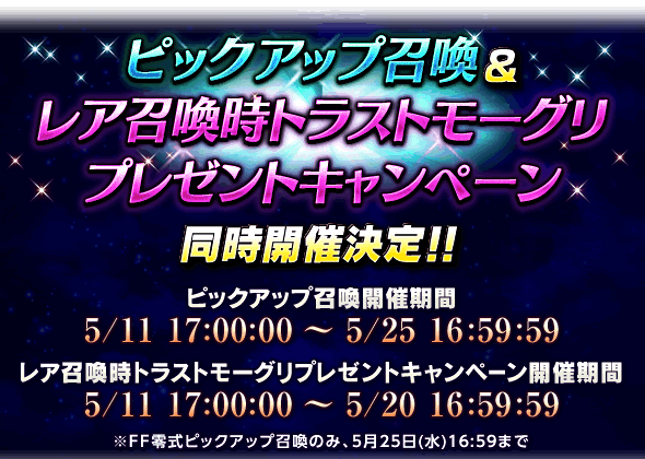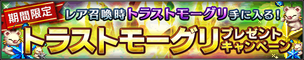 同時開催のキャンペーンにより、召喚時通常ユニット1体につき★3~★5いずれか1体のトラストモーグリをプレゼントいたします!